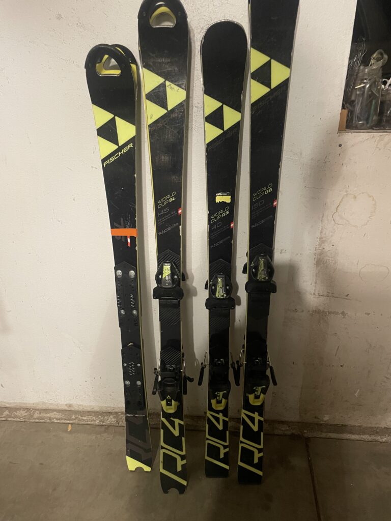 Details: Adult small turquoise jacket $50Adult medium turquoise jacket $50Skis $50 each:Tecnica 24-24.5 $75Nordica 24-24.5 $35Fisher Worldcup 155Dynastar 138